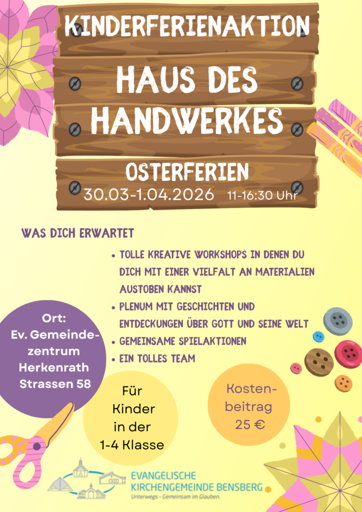30. März bis 1. April 2026: In den Osterferien wird es kreativ im Evangelischen Gemeindezentrum Herkenrath: Bei der Kinderferienaktion „Haus des Handwerkes“ können Kinder der 1.–4. Klasse an drei spannenden Nachmittagen basteln, bauen und verschiedene Materialien ausprobieren. Neben kreativen Workshops erwarten die Kinder Geschichten über Gott und seine Welt, gemeinsame Spielaktionen und ein tolles Team.