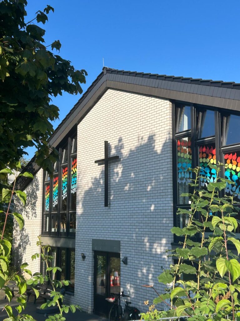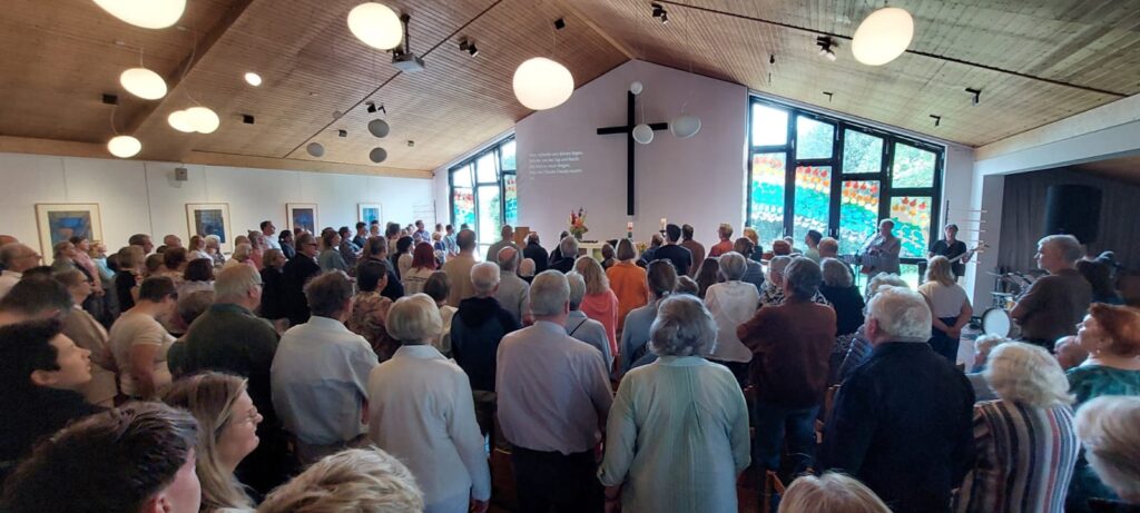 Bei offenen Fenstern und Türen, mit schwungvollen Liedern, einem eindrucksvollen Anspiel der Kinder der Herkenrather Ferienfreizeit und einer wunderschönen Regenbogen-Dekoration an den Fenstern wurde der Gottesdienst zu einer umfassenden Botschaft des Miteinanders und Zusammenhalts. Alles ist mit allem verbunden, ob die 4 Elemente, ob jeder einzelne Mensch mit seinem Nachbarn, der Natur und dem damit verbundenen Klima. Nur zusammen können wir etwas erreichen, auch in der Region Bergisch-Süd-Ost, wie Pfarrer Samuel Dörr zu Beginn in den Gottesdienst einführte. Rainer Beerhenke komponierte mit „seiner“ Band ein tolles inhaltliches und musikalisches Beisammensein, sodass unter Beteiligung aller zuletzt Regenbogenfähnchen geschwenkt wurden. Der Regenbogen als Zeichen der Verbindung mit einem Gott, der sagt: Ich bin alle Zeit bei dir!