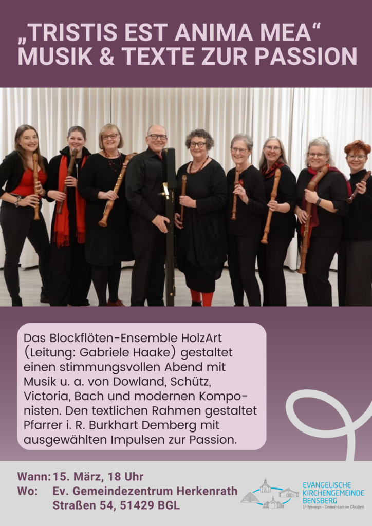 15. März 2026: Das Blockflöten-Ensemble HolzArt unter der Leitung von Gabriele Haake spielt im Gemeindezentrum Herkenrath Musik u. a. von Dowland, Schütz, Victoria, Bach und auch modernen Komponisten. Das Ensemble setzt das gesamte Blockflötenquartett sowohl im 4-Fuß-, als auch im 8-Fuß-Register ein, wodurch ein orgelähnlicher Klang entsteht.